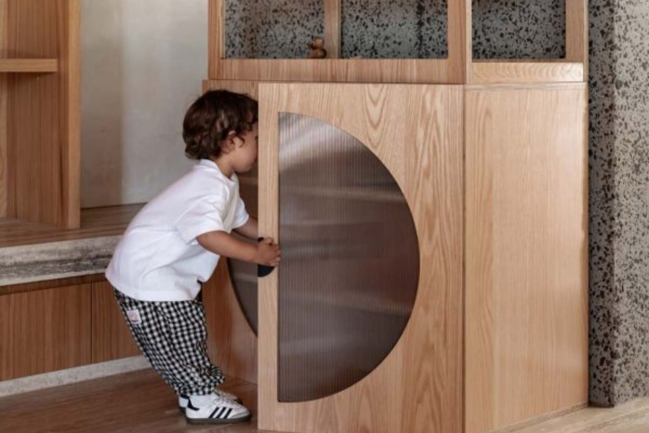 The fluted detail is paired with a circular Perspex panel, adding a playful touch while allowing a glimpse inside.
