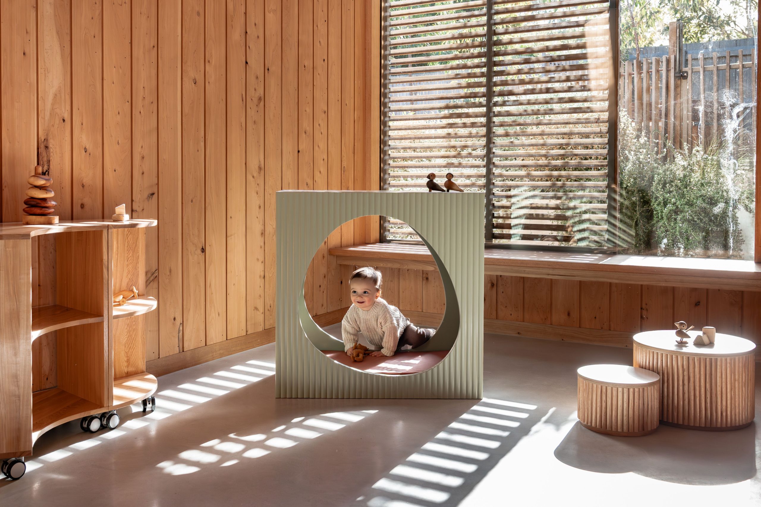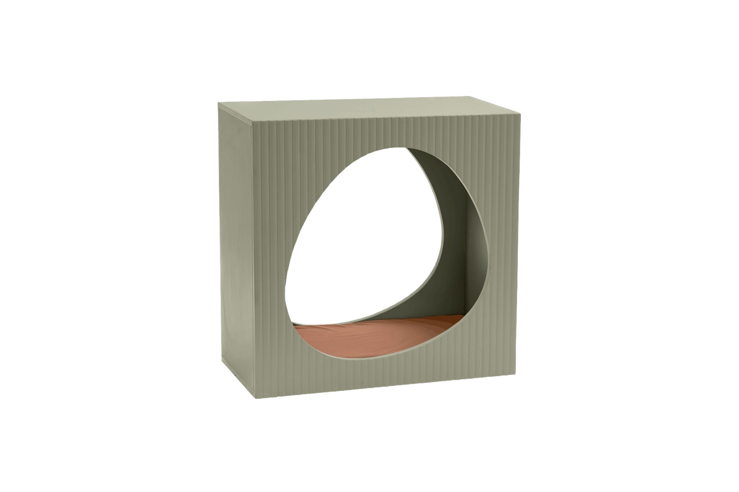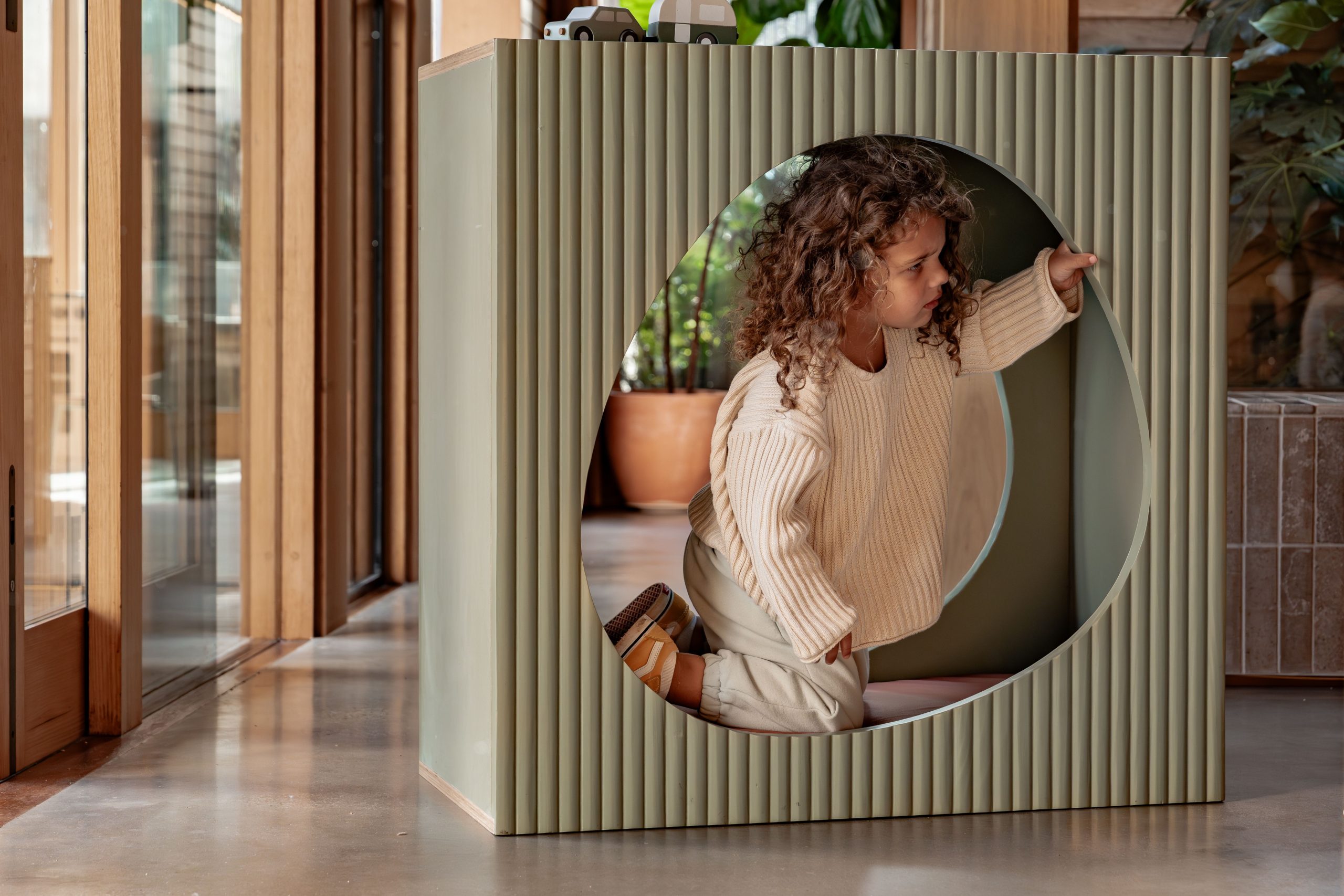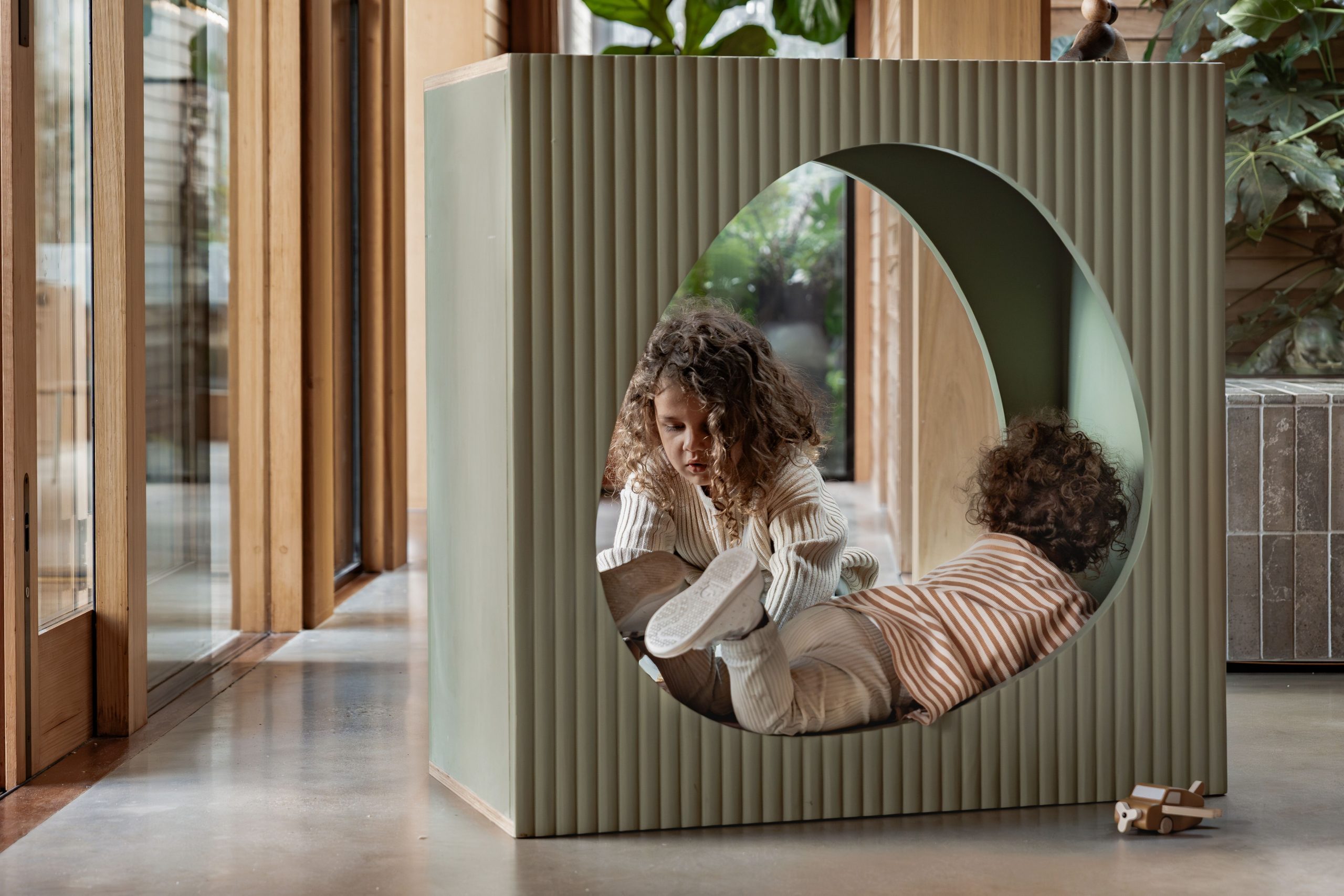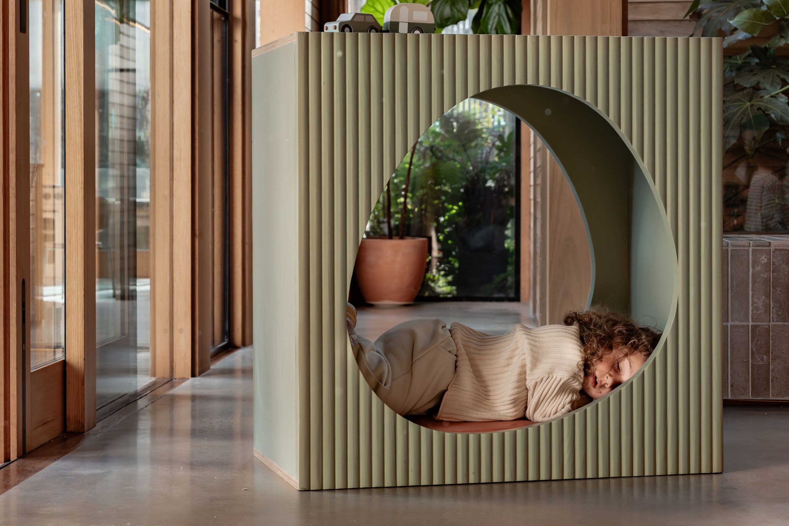 Square on the outside with a smooth egg-shaped opening at the centre, the Fluted Nook is designed to invite kids into their own private world.