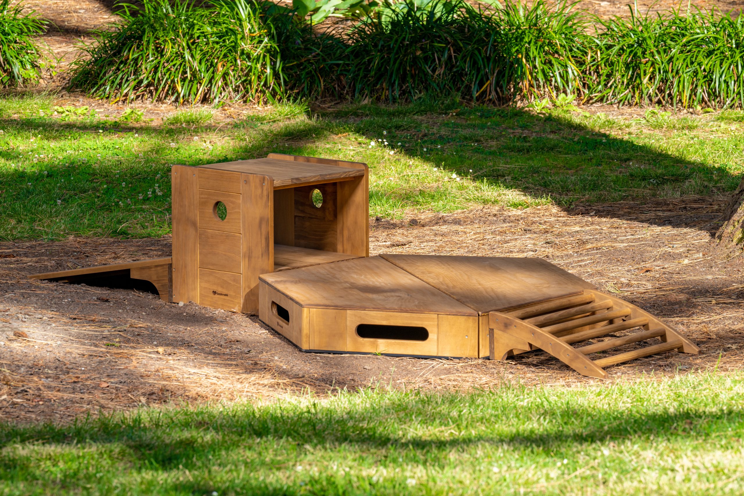 Specifically designed for babies – Outdorable Baby Package 5 pc 0-2 years as they learn some of life’s most significant skills. Fully interchangeable to allow creating multiple configurations. All items are interlocking using the same connection slots as our larger climbing sets. Gross motor skills are critical to enabling children to perform everyday functions, such as walking and running, climbing and catching, throwing and hitting a ball. However, these are also crucial for daily self-care skills like getting dressed, getting into bed, climbing stairs or getting in and out of a car. Putting toys away and navigating around objects in the classroom and on the playground on different slopes and surfaces. Gross motor abilities also influence other everyday functions. For example, a child’s ability to maintain appropriate tabletop posture (upper body support) will affect their ability to participate in fine motor skills like writing and craft, cutting paper etc. Also sitting upright with good back posture to listen to the teacher’s instructions, which in turn has a direct impact on their future learning. The two trapezoidal shape platforms (pictured as a hexagon) are only 150mm high, which makes an excellent riser for infants. You can easily add more risers together to create a larger platform. The Incline Ramp is nice and wide with a gentle slope for infants to learn on. The Log Crawler provides a more challenging experience as infant’s progress. With smooth dowels stretched across a curved ramp, the log crawler is one of the favourites. The Burrow with peepholes creates a small tunnel for children to develop spatial awareness.