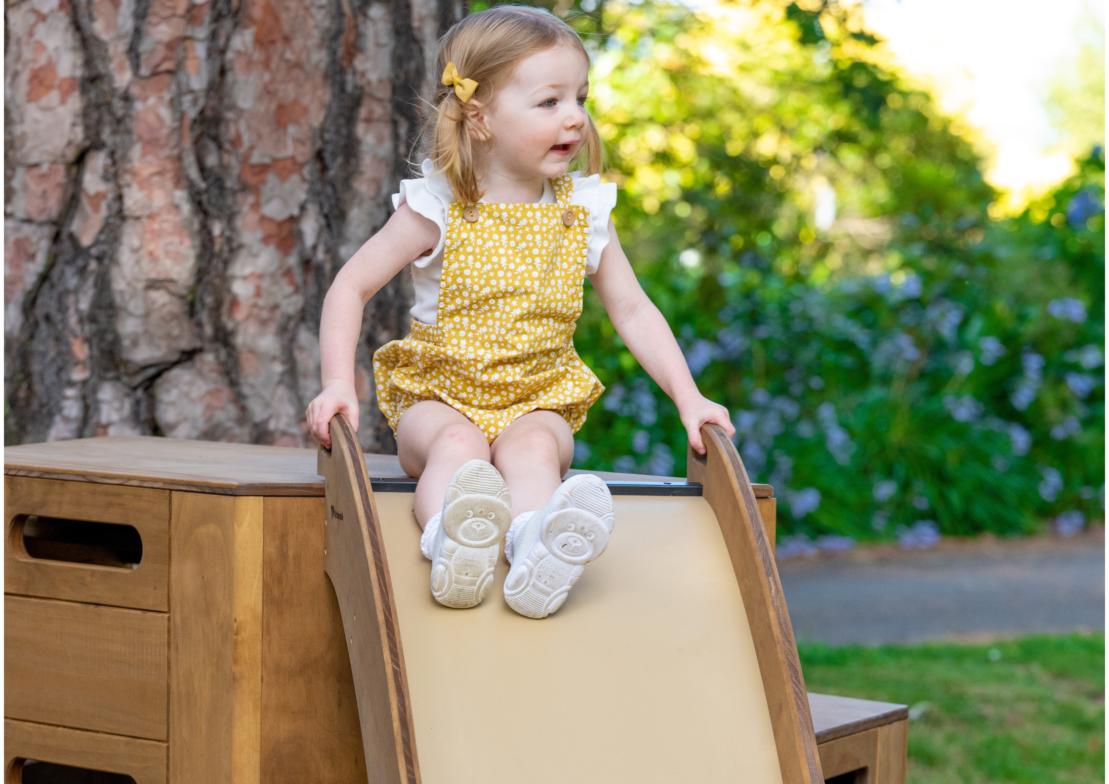 Our play equipment is crafted from Accoya, a highly durable and sustainable wood species. As a natural material, it may develop small hairline splits or ‘checks’ as it adjusts to outdoor conditions. This is a normal part of the timber’s lifecycle and does not affect its strength or longevity.
