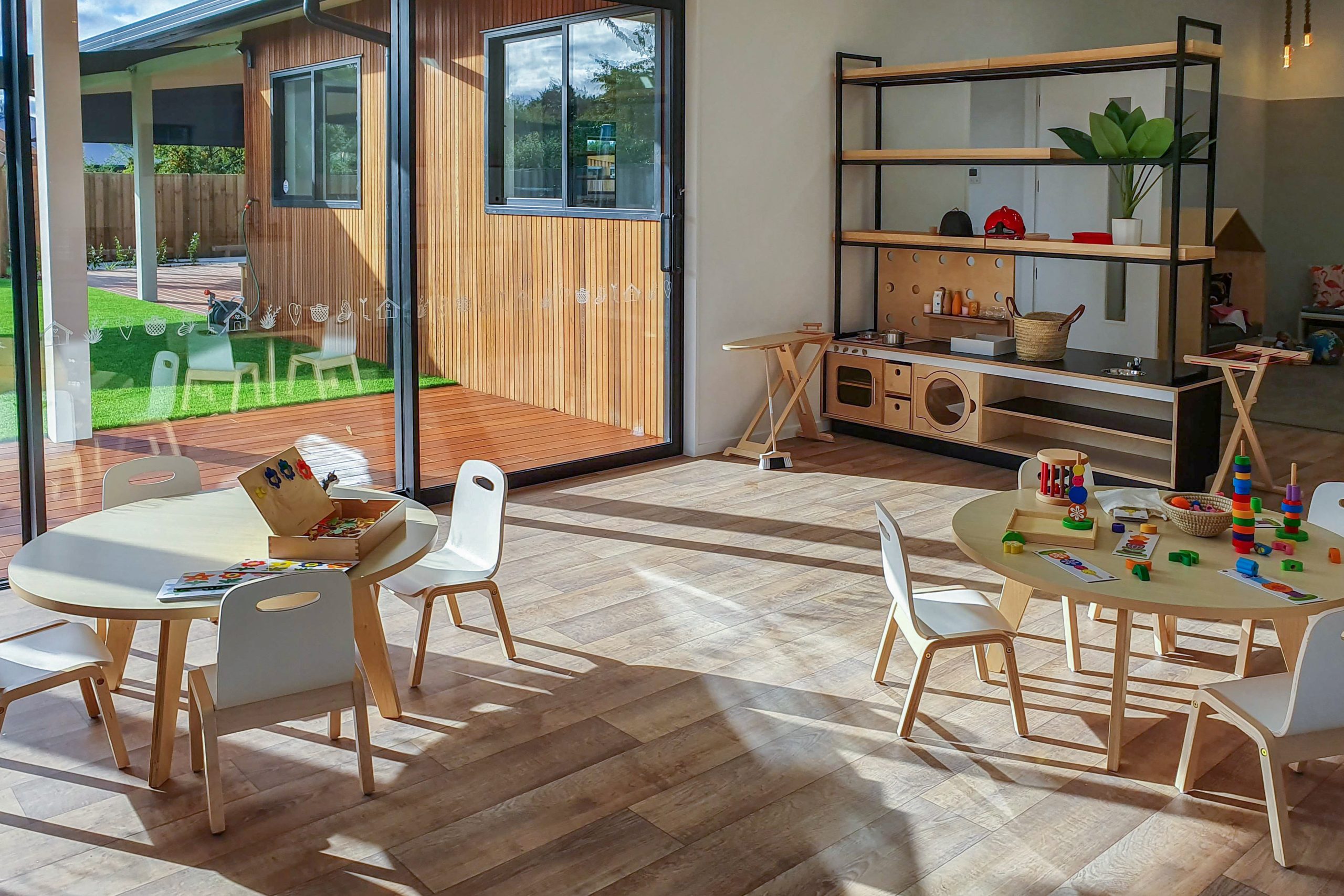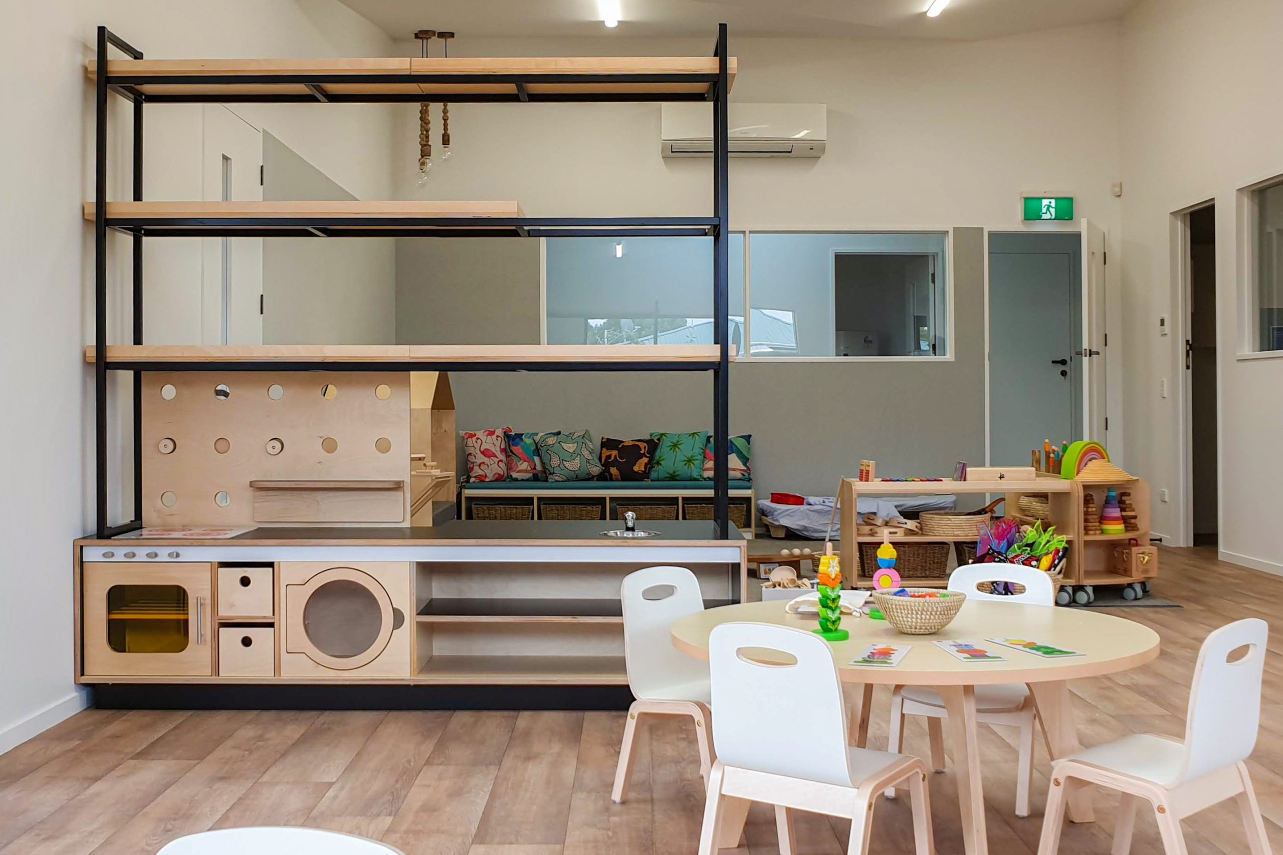 Wooden table legs set in for maximum seating space around the table