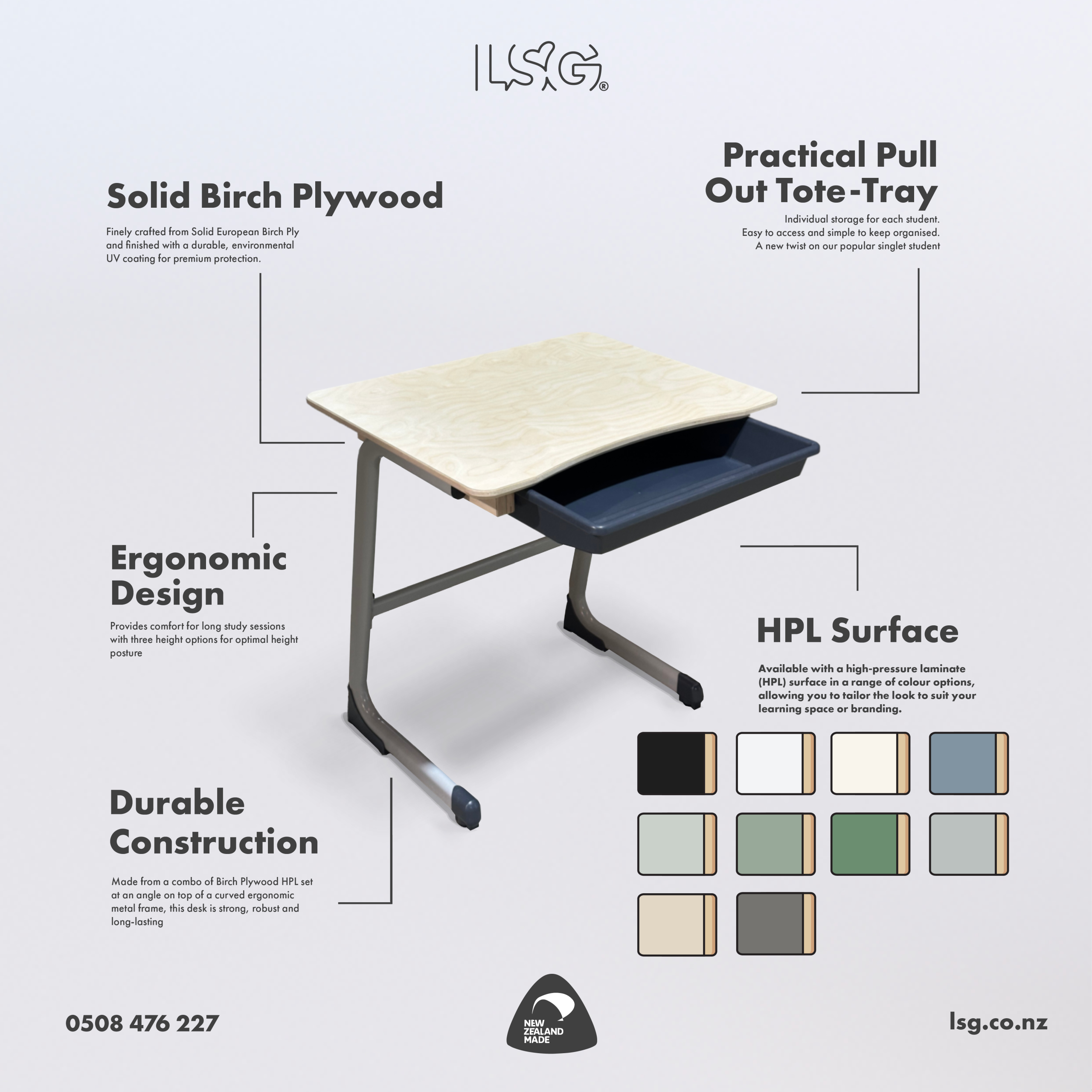 Constructed from premium Birch Plywood HPL and a ergonomic solid metal frame, this desk delivers long-lasting strength and durability for everyday classroom use. While the pull-out tote tray offers smart, accessible storage, keeping books, stationery, and personal supplies neatly organised.