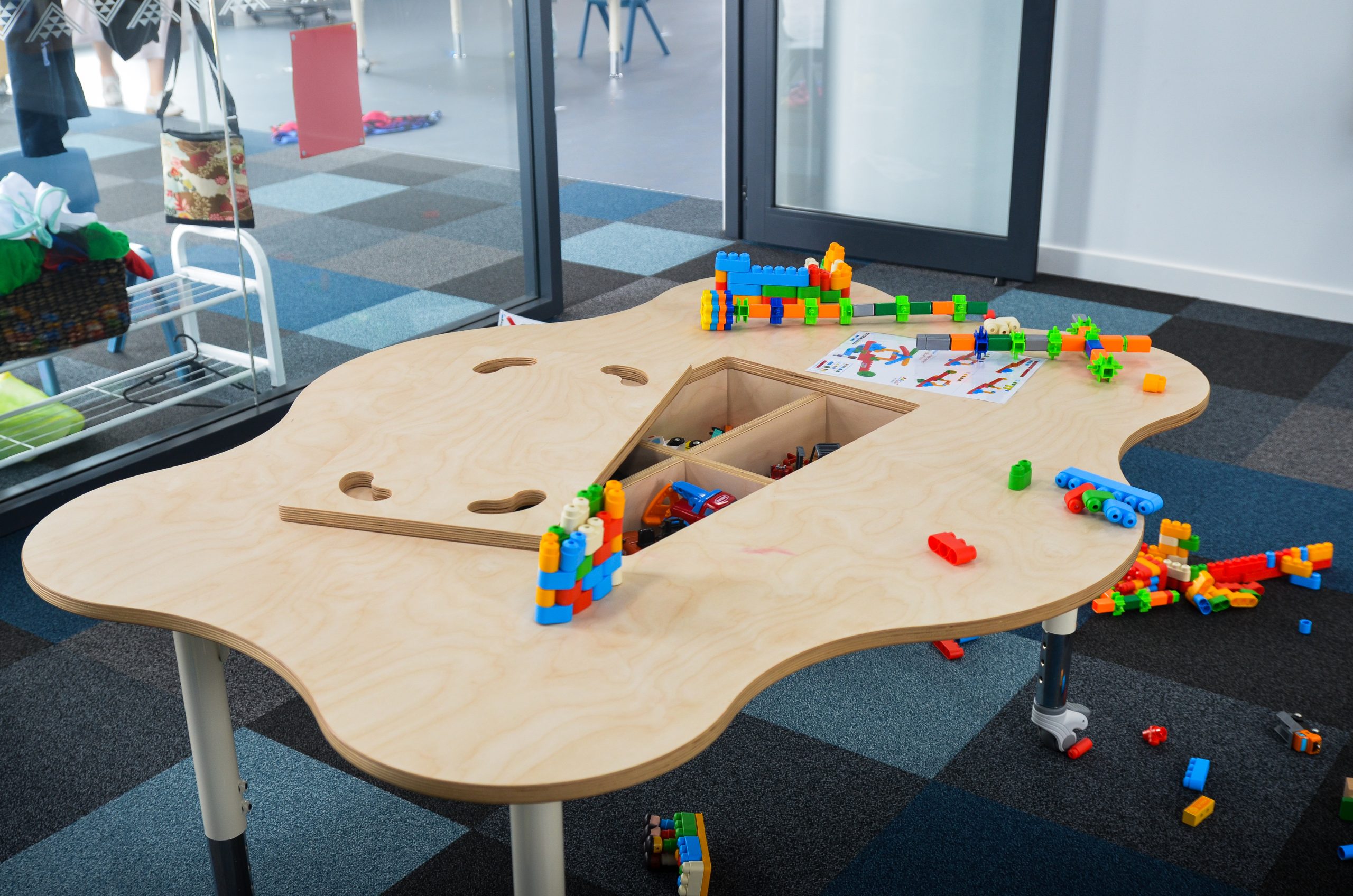 The Splash Lego Table includes central compartments for Lego, pencils, and other resources. Each table cut‑out gives children their own workspace and helps them collaborate during group tasks. The curved, modern design softens the classroom and creates a more homely feel than traditional straight‑lined furniture.