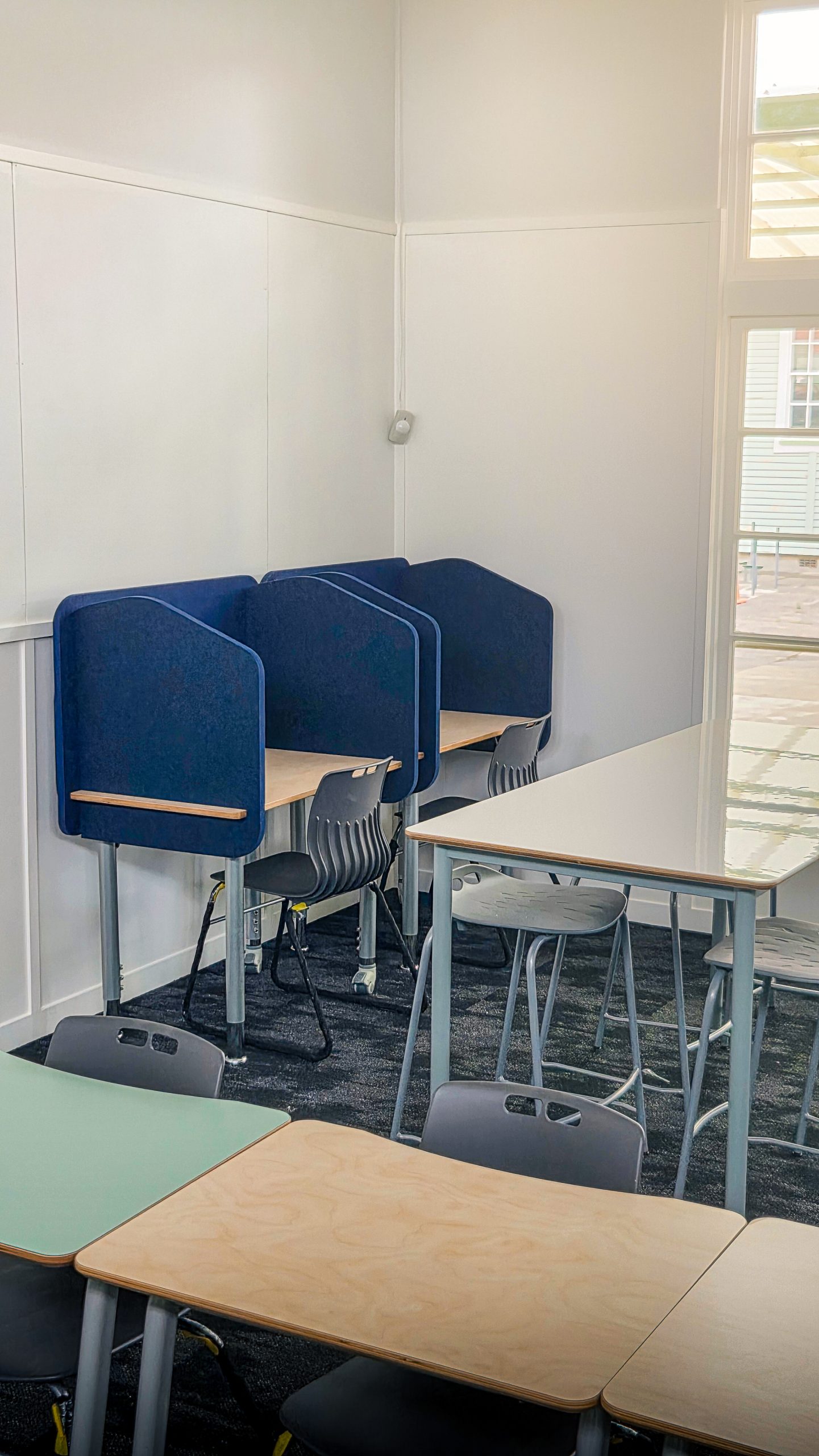 Student Carrel Table with acoustic panel sides. This table supports individual student work with a working desk space of 710mm x 570mm. Enabling the student to set themselves apart from their peers to focus on the task at hand.