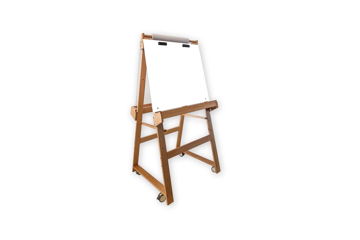 Wooden Easel with adjustable Perspex Double sided easel with perspex, clips for paper and paint trays on both sides.